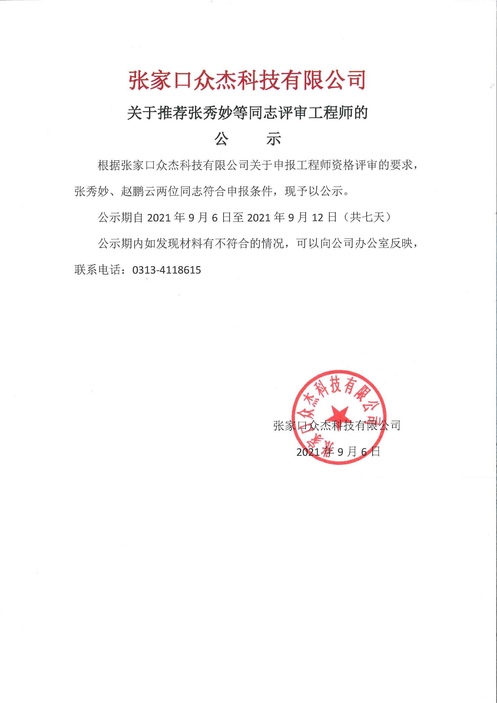 根據(jù)張家口眾杰科技有限公司關于申報工程師資格評審的要求,張秀妙、趙鵬云兩位同志符合申報條件,現(xiàn)予以公示。